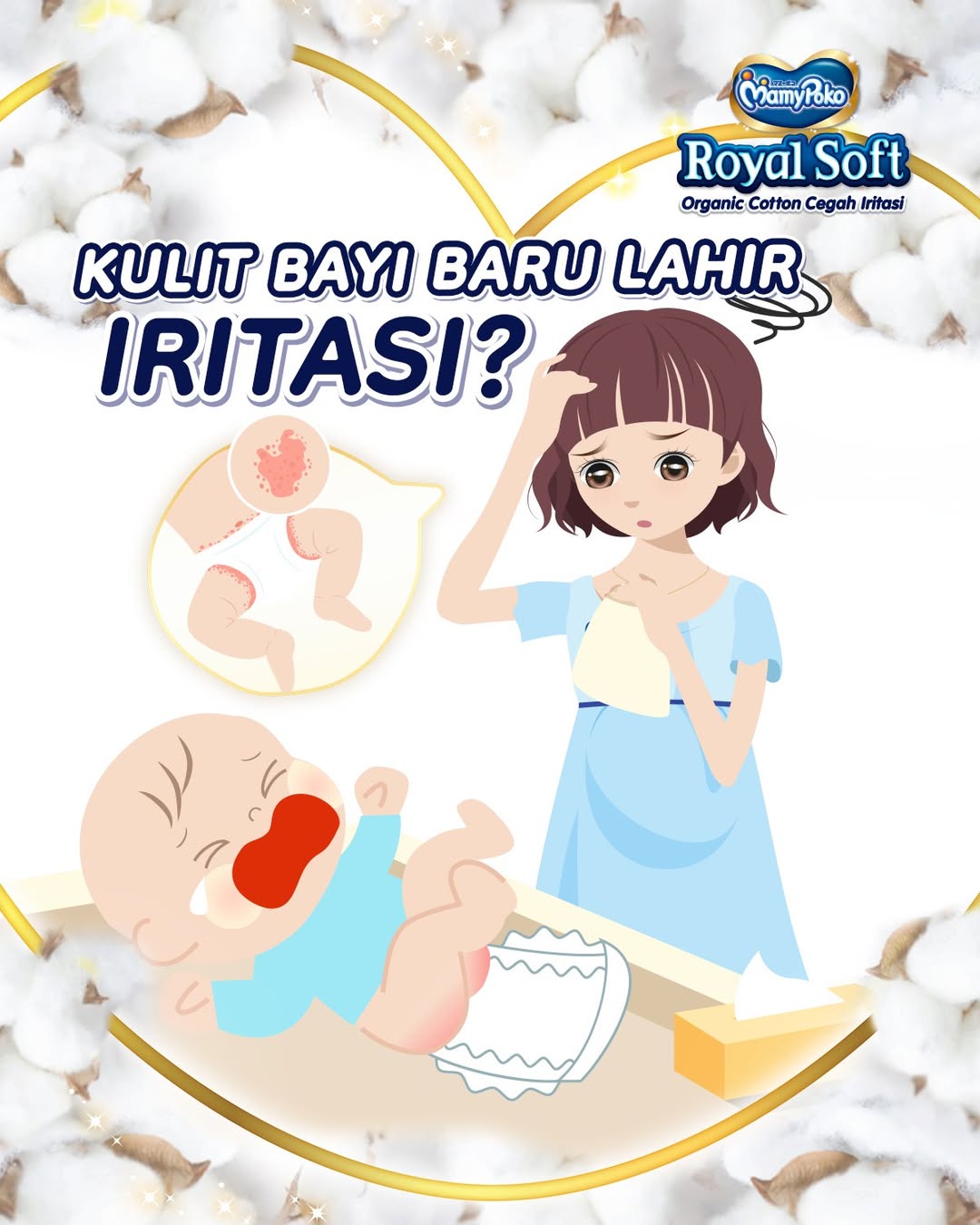 Mamy yang baru melahirkan si Kecil juga tak perlu khawatir dan bingung untuk memilih popok terbaik untuk kulit si Kecil baru lahir, karena MamyPoko mempersembahkan perlindungan terbaik untuk kulit bayi baru lahir yang belum pernah ada sebelumnya di Indonesia MamyPoko Royal Soft Organic Cotton Lebih Cepat Kering dan Teruji Klinis 2X Lebih Baik Cegah Iritasi. Sehingga lebih aman untuk kulit si Kecil yang masih sensitif. Dilengkapi juga dengan inovasi baru Soft & Fit. Karet pinggang elastis memeluk lembut pinggang bayi, sehingga pas di badan untuk mengurangi resiko bocor belakang, nyaman dan bebas iritasi